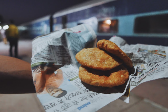 在一趟夜班火車靠站時,我們跟著當地人一起下車,發現好多人都圍著月台上唯一的一個熟食攤買東西吃,一看是各種油炸食品,當時因為嘴饞,又驚訝於這小食肆擁有讓大夥兒搶購的魅力,於是就斗膽也買了幾片長相類似我們這邊咸煎餅的燒餅,小販徒手抓起熱騰騰的四片燒餅,然後順勢撕來一張報紙,就這麼裹起來遞到我鼻子面前。